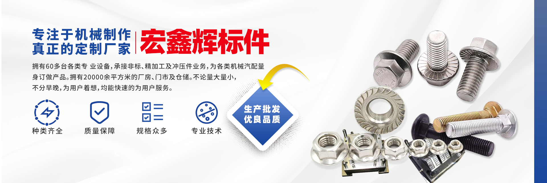 四川宏鑫輝標(biāo)準(zhǔn)件制造有限公司下設(shè):南充市宏輝機(jī)械制造有限公司,南充市聚宏機(jī)電設(shè)備有限公司,公司始建于1994年。為了拓展市場(chǎng),降低成本,本公司于2007年、2020年分別在南充、 成都、重慶創(chuàng)建了生產(chǎn)基地。擁有60多臺(tái)各類專 業(yè)設(shè)備,承接非標(biāo)、精加工及沖壓件業(yè)務(wù),為各 類機(jī)械汽配量身訂做產(chǎn)品。擁有20000余平方米的廠房、門市及倉(cāng)儲(chǔ)。公司以誠(chéng)信為本,竭誠(chéng)為廣大客戶提供服務(wù)。不論量大量小,不分早晚,為用戶著想,均能快速的為用戶服務(wù)。 公司所生產(chǎn)及代理的產(chǎn)品為業(yè)界人士公認(rèn)的國(guó)內(nèi)、國(guó)際優(yōu)等品牌。在產(chǎn)品性能與質(zhì)量